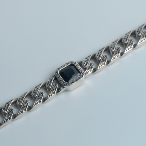 Bold Silver Curb Chain Bracelet with a striking Emerald-Cut Black Gemstone. Intricate oxidized patterns and ornate bezel setting create a sophisticated, edgy look.