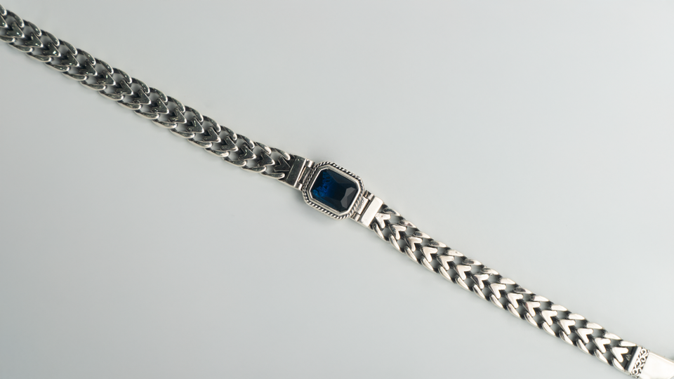Make a bold statement with our Silver Foxtail Chain Bracelet featuring an emerald-cut blue gemstone. Crafted from premium silver with oxidized accents, it combines antique charm with modern style. The intricate foxtail chain and rope-edged bezel highlight its refined craftsmanship, while the secure lobster clasp ensures lasting wear. Perfect for adding masculine elegance to any outfit, this timeless bracelet suits both daily wear and special occasions.